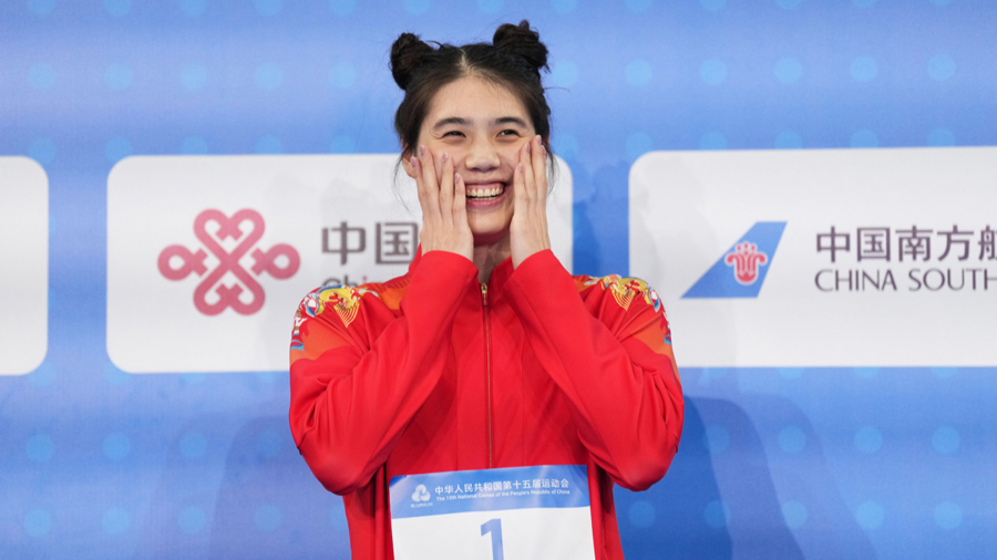 新华社照片,深圳(广东),2025年11月16日\n 11月16日,获得冠军的江苏队选手张雨霏在颁奖仪式上。\n 当日,第十五届全国运动会游泳女子50米蝶泳决赛在深圳举行。\n 新华社记者 丁增尼达 摄