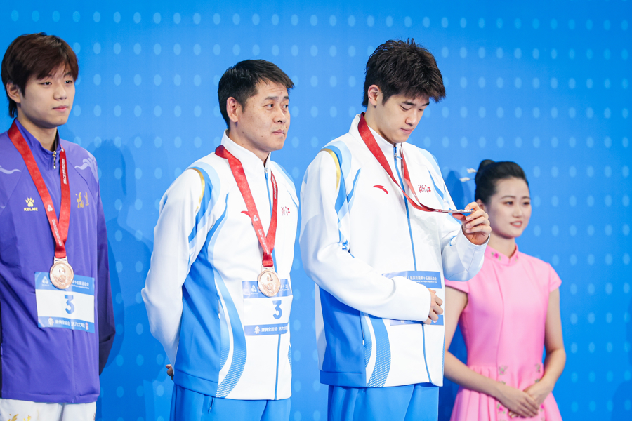 颁奖仪式上,潘展乐端详着自己的铜牌,他对奖牌的颜色似乎并不满意(本报记者王竟成摄)