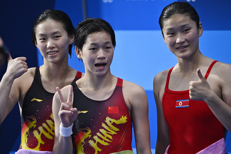 2024年8月6日,冠军中国选手全红婵(中)、亚军中国选手陈芋汐(左)、季军朝鲜选手金姬燕在比赛后。\n 当日,巴黎奥运会跳水项目女子10米跳台决赛在巴黎奥林匹克水上运动中心举行。\n 新华社记者 王鹏 摄