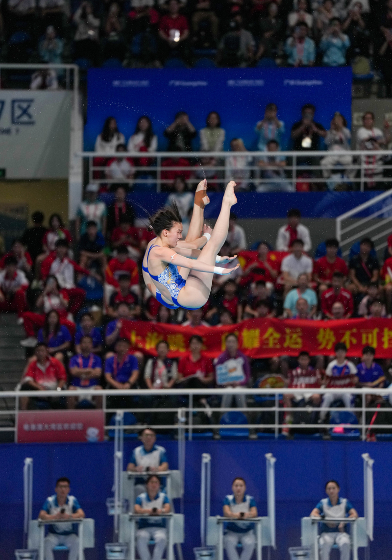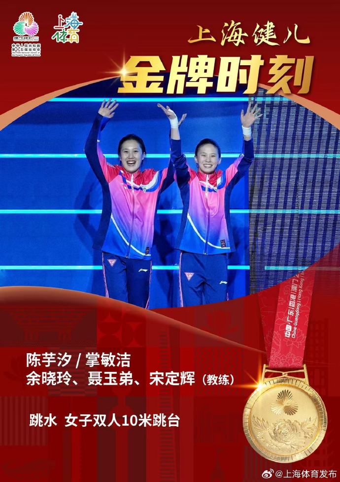 四年前的陕西全运会,陈芋汐第一次参加全运会,搭档张家齐夺得双人十米跳台冠军,此前两人还在东京奥运会该项目中夺金;四年之后的大湾区全运会,搭档换成了同样来自上海的掌敏洁,陈芋汐成功实现了全运会女子双人 10 米跳台的卫冕。