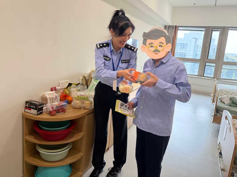 重阳节到了,住在徐汇一家养老院里的八旬老人余老伯又见到了斜土路派出所社区民警王慧蓉。带着重阳糕来探望他的这位女民警,已经成了余老伯的“编外亲人”。